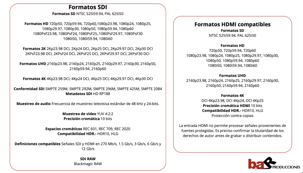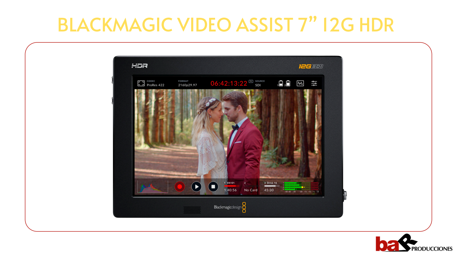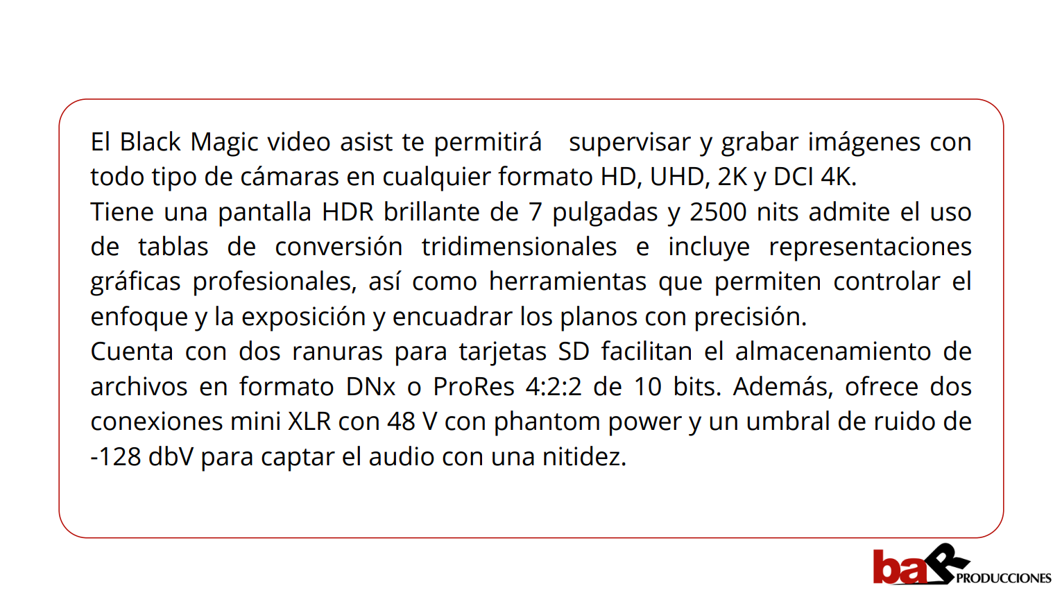 El Black Magic video asist te permitirá supervisar y grabar imágenes con todo tipo de cámaras en cualquier formato HD, UHD, 2K y DCI 4K.  Tiene una pantalla HDR brillante de 7 pulgadas y 2500 nits admite el uso de tablas de conversión tridimensionales e incluye representaciones gráficas profesionales, así como herramientas que permiten controlar el enfoque y la exposición y encuadrar los planos con precisión. Cuenta con dos ranuras para tarjetas SD facilitan el almacenamiento de archivos en formato DNx o ProRes 4:2:2 de 10 bits. Además, ofrece dos conexiones mini XLR con 48 V con phantom power y un umbral de ruido de -128 dbV para captar el audio con una nitidez.