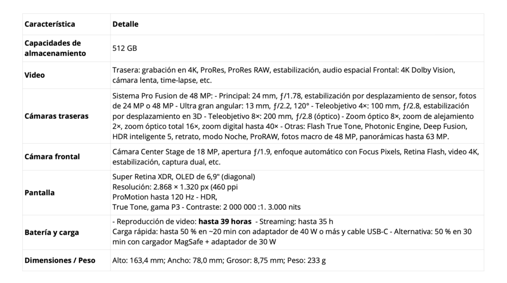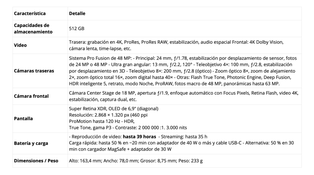 Grabación profesional que combina portabilidad con capacidades cinematográficas avanzadas, integrando un sistema de cámaras triple de 48 MP con grabación en 4K hasta 120 fps, ProRes RAW y Apple Log, ideal para flujos de trabajo de cine y contenido digital. Su potente chip A19 Pro, pantalla Super Retina XDR de 6.9” con 120 Hz y alto brillo, junto con funciones como genlock para sincronización multicámara. Gracias a su excelente rango dinámico, estabilización avanzada y compatibilidad con workflows profesionales, es perfecto para grabación en locación, social media y cine móvil de alta calidad.