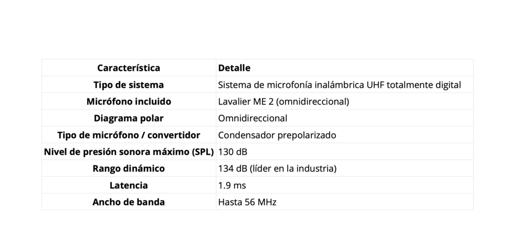 Micrófono inalámbrico digital, opera en un rango de frecuencias UHF lo que ofrece audio limpio, estable y sin interferencias gracias a su tecnología UHF digital, superior en alcance y confiabilidad frente a sistemas 2.4 GHz. Con un amplio rango dinámico de 134 dB y latencia ultrabaja. Este sistema ofrece además un ancho de banda de hasta 56 MHz, lo que permite mayor flexibilidad para encontrar frecuencias limpias y evitar interferencias en entornos de grabación exigentes.